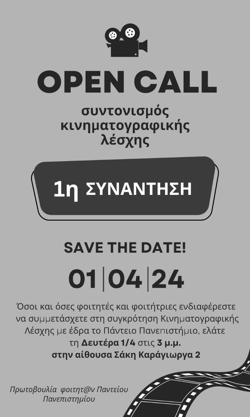 Την Δευτέρα 01 Απριλίου του 2024 θα πραγματοποιηθεί, στο Πάντειο Πανεπιστήμιο στο αμφιθέατρο Σάκη Καράγιωργα 2 και ώρα 15:00 μ.μ. , η πρώτη συνάντηση για τον συντονισμό κινηματογραφικής λέσχης με έδρα το Πάντειο Πανεπιστήμιο.